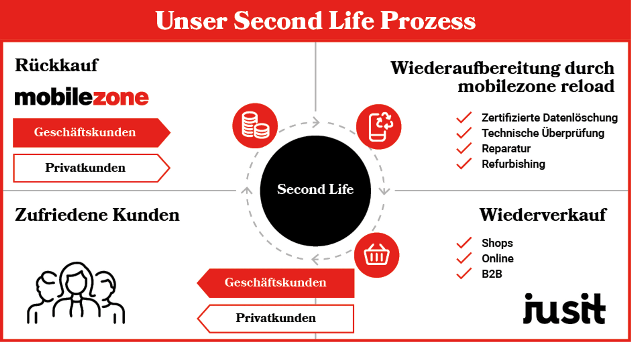 Die wiederaufbereiteten Geräte werden wieder in den Verkauf gegeben. Mit der Marke jusit bieten wir in der Schweiz eine nachhaltige Alternative für alle, die ein hochwertiges, wiederaufbereitetes Smartphone suchen, sei es als Hauptgerät oder als kostengünstige Zweitlösung. Wer – wie wir – Wert auf Nachhaltigkeit legt, findet mit jusit eine smarte Möglichkeit, Ressourcen zu schonen und zugleich Geld zu sparen.