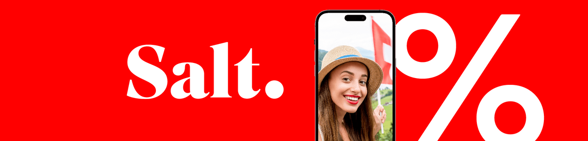 *Gültig vom 06.04.2026 bis 19.04.2026 bei Neuabschluss von Salt Travel Plus (CHF 34.95/Mt. statt 99.95) für 24 Monate. Der Rabatt von CHF 65.– wird pro Monat auf der Rechnung gutgeschrieben. Exkl. Aktivierungsgebühr von CHF 59.95. Zusätzlich CHF 100.– geschenkt. Mindestvertragsdauer 24 Monate.
